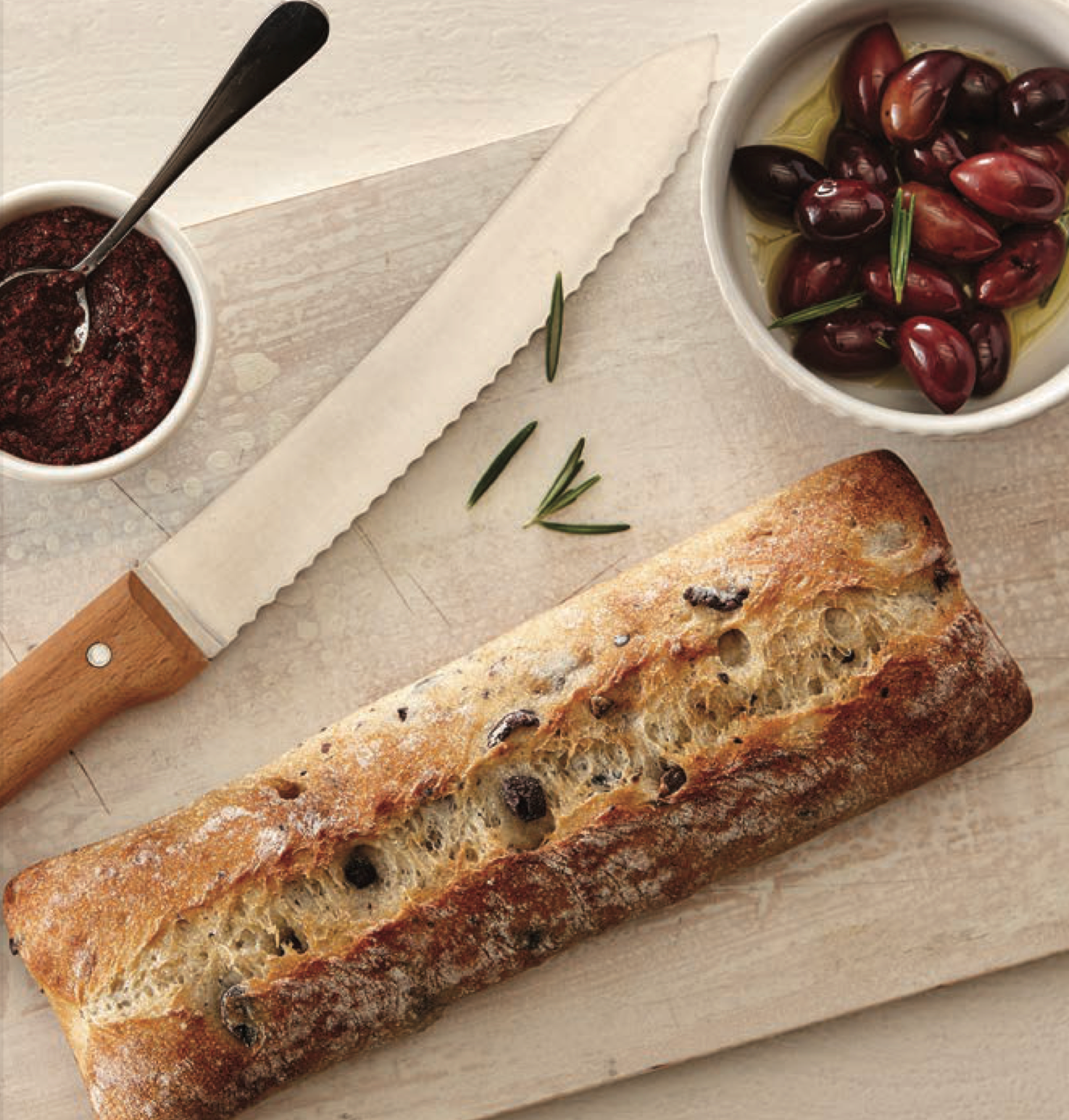 My love language is bread. This bread is made with unbleached, untreated, enriched wheat flour, water, Kalamata olives, sea salt, yeast, fine herbs and malted barley.